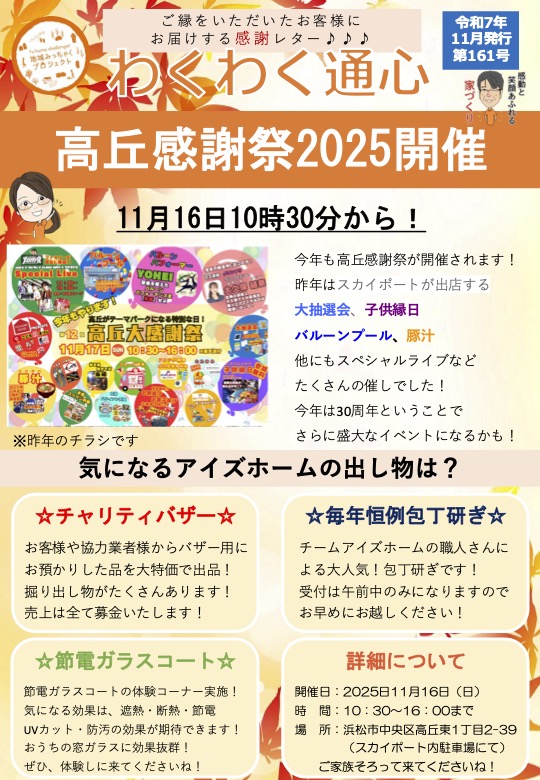 2025年11月16日(日)、浜松市中央区高丘東にあるスカイポート駐車場にて、毎年恒例の「高丘大感謝祭」が開催されます。